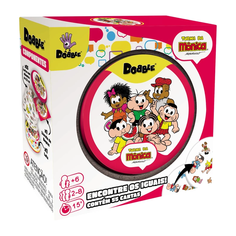 Dobble: Turma da Mônica é uma edição especial que une a diversão do clássico Dobble com os personagens mais queridos dos quadrinhos brasileiros! Com ilustrações super divertidas da Mônica, Cebolinha, Cascão, Magali, Chico Bento e toda a turma, suas partidas vão ficar ainda mais animadas!
